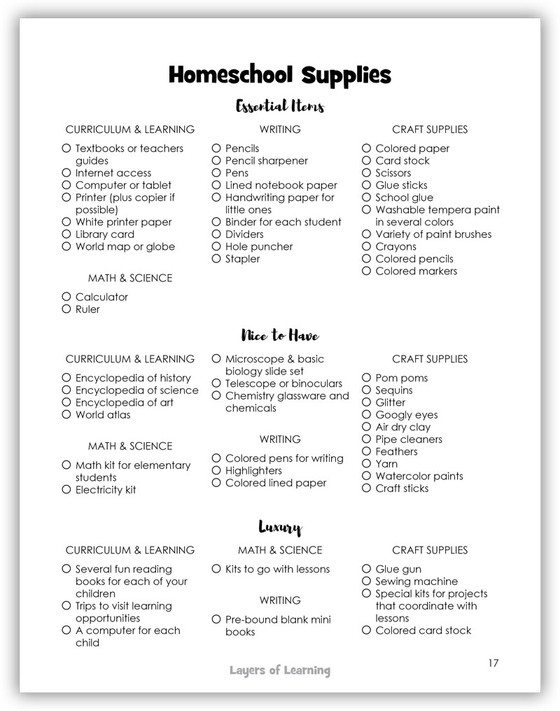 Next we provide you with a big list of basic supplies that nearly every homeschooler has or wants. It is divided into three sections: essential, nice to have, and luxury. Just stock up on what you can. Don’t worry, before you know it your major problem will be finding space to store all this stuff.