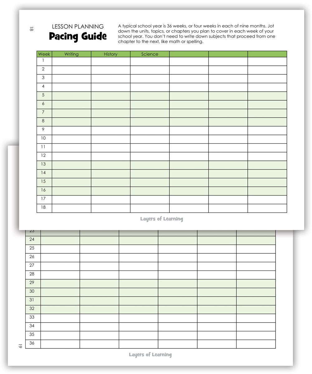 A pacing guide helps you to figure out how to space out the topics or lessons to exactly fill your school year. A typical school year is 36 weeks. The weeks are easily divided into nine months of four weeks each.