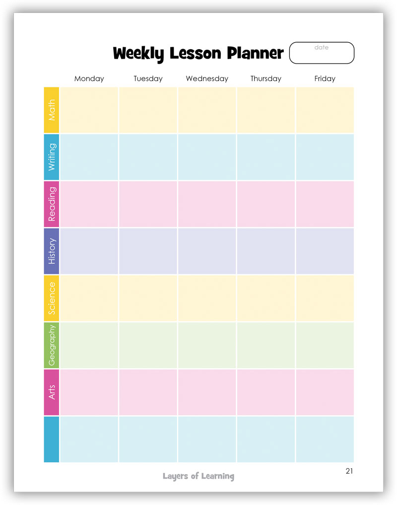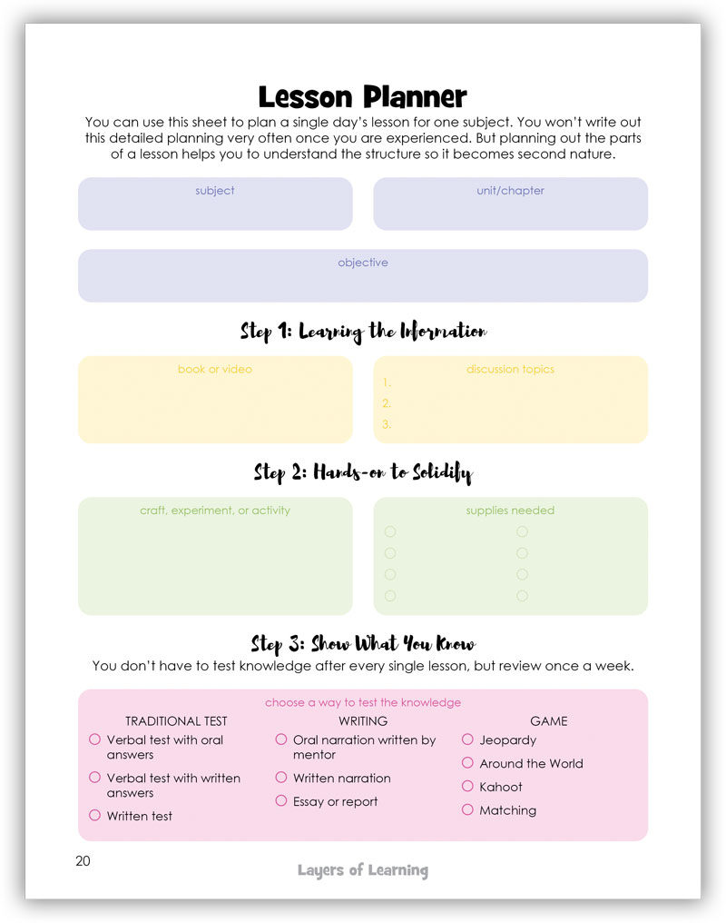 This is the final section of the packet. A lesson is a single day’s lesson on a single subject. For at least half of your subjects you won’t need to do any lesson planning. Math is usually just moving to the next chapter, tutoring the concept, and having your child work problems. Same with spelling and grammar. There’s no prep, just the next page in the workbook. But other subjects, like history or science, usually require more thought and time.