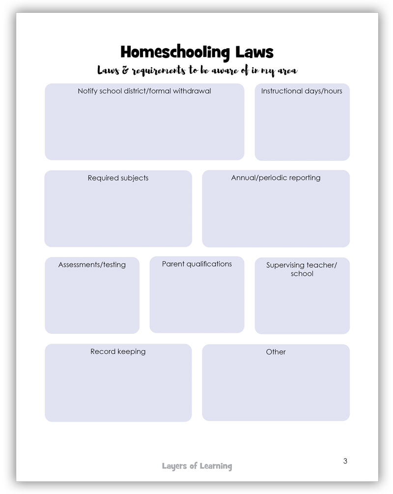 Next is a page where you can make notes about the homeschool laws where you live. It’s extremely important to follow the law. Not to freak you out or anything, but kids can be taken from a parent if the state suspects the children are not being educated.