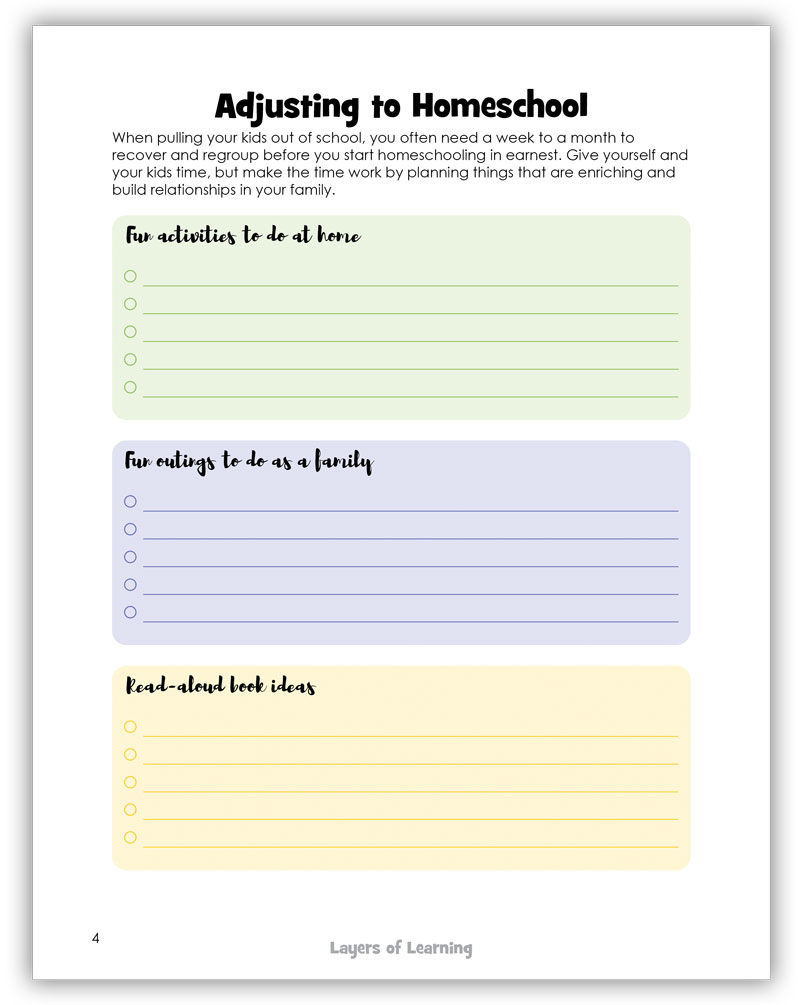 If your kids are being taken out of public school, everyone in your family needs a few weeks to decompress, to have a brain break, and to reset their emotional and mental state. You need rest and a clean break. So take the time you need. There is a page in the planner that helps you list some fun activities and read-aloud books that can help in the reset and reconnect your family.