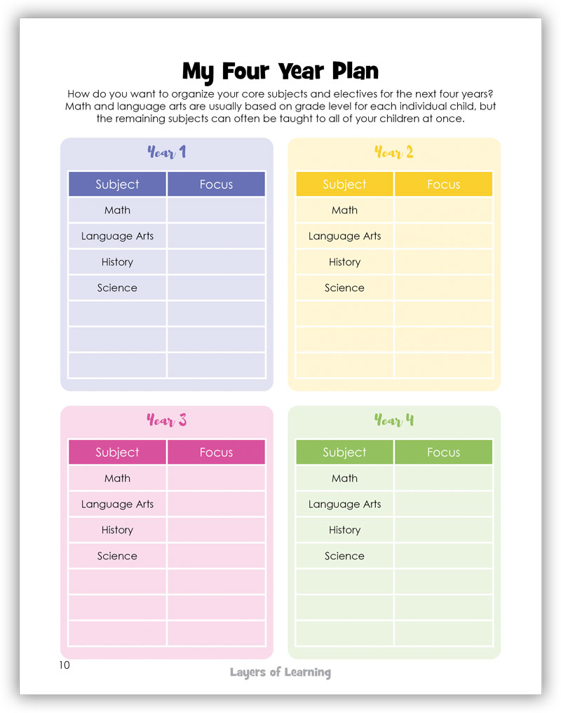 Next you will plan the next four years. Layers of Learning works around a four year cycle. It takes four years to get through all of history, geography, science, and art. Even if you don’t use Layers of Learning, it is helpful to break down the 12 years of your child’s schooling into three manageable chunks to include the early years, the middle grades, and then high school.
