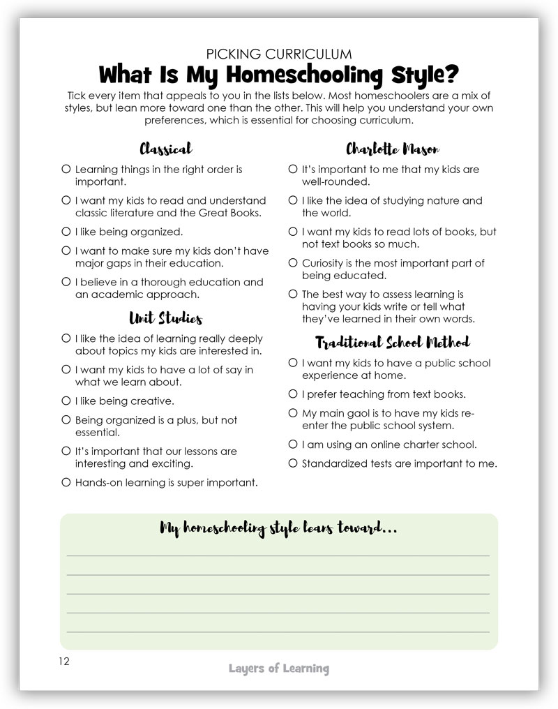 The first step in picking curriculum is defining what is important to you and figuring out how your personality meshes with some of the major homeschooling styles. So we created a simple a checkbox questionnaire that helps you define what is important to you in education and these checkboxes will help you to see what your homeschool style is.