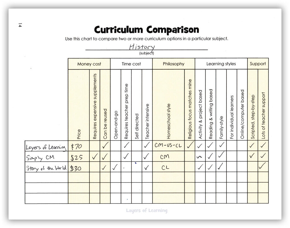 The next sheet is a chart that helps you compare various curriculum options after you have searched online for “Charlotte Mason history curriculum” or whatever your style is. This part of picking curriculum takes time. You’ll probably spend, at least, several hours on each subject. Then you’ll do it again next year, and the year after that . . .