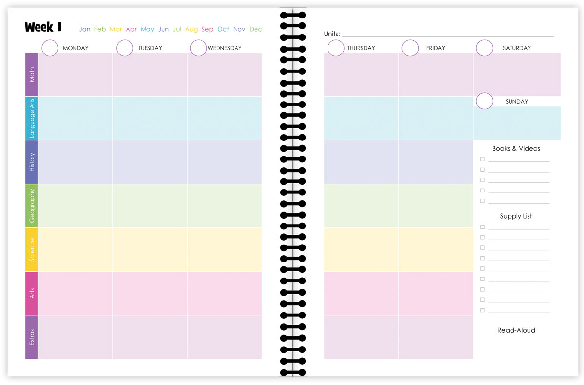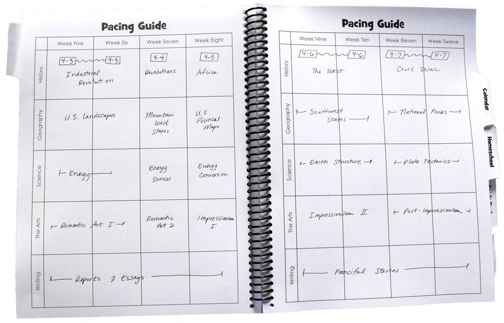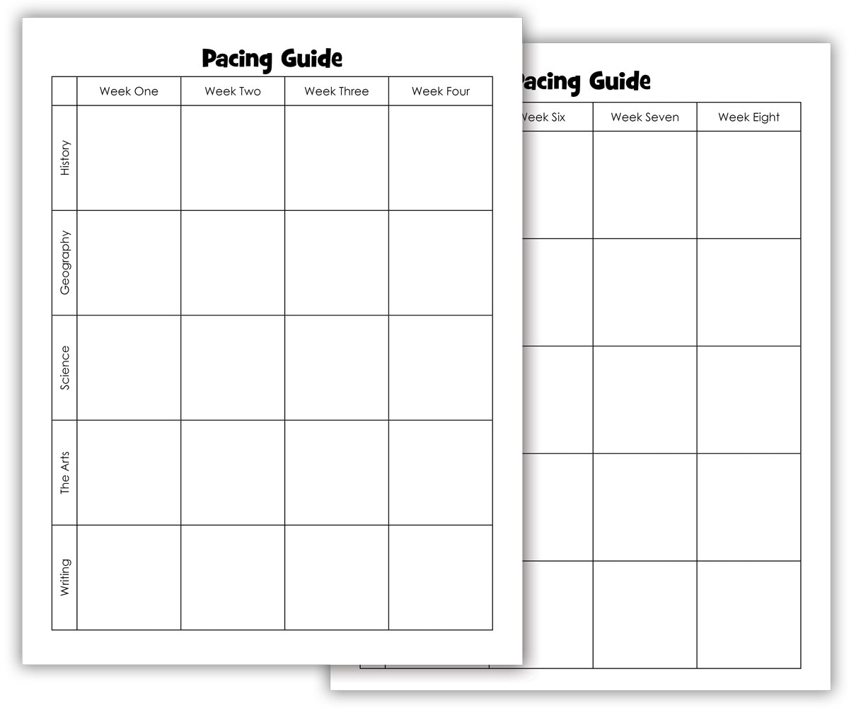 The Pacing Guide helps you plan out how much time to spend on each topic, read-aloud, subject, or project before moving on. It includes 36 weeks, just like the Weekly Planner.