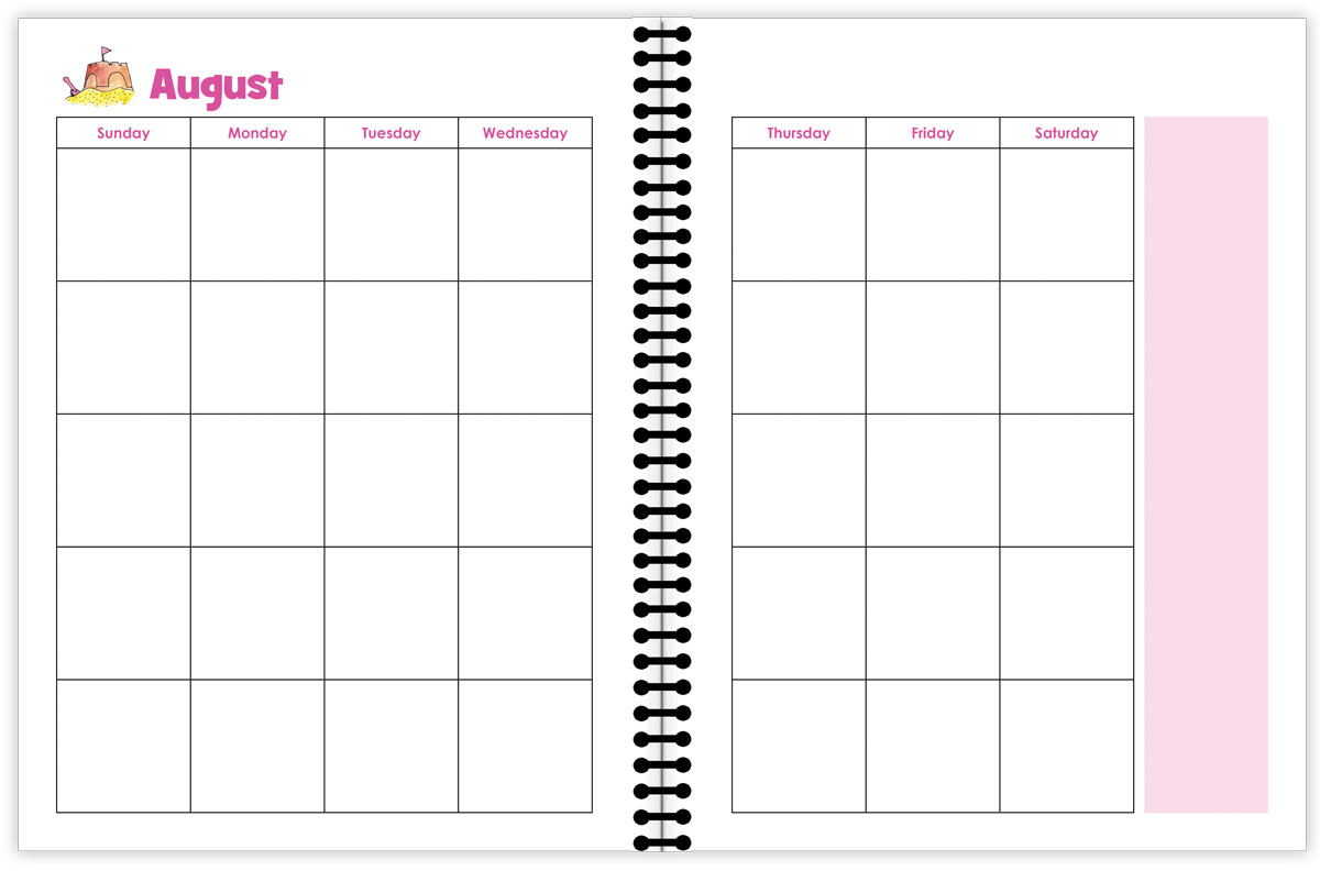 This section has monthly, undated calendars, each across a two-page spread. The year begins in August and ends with July.